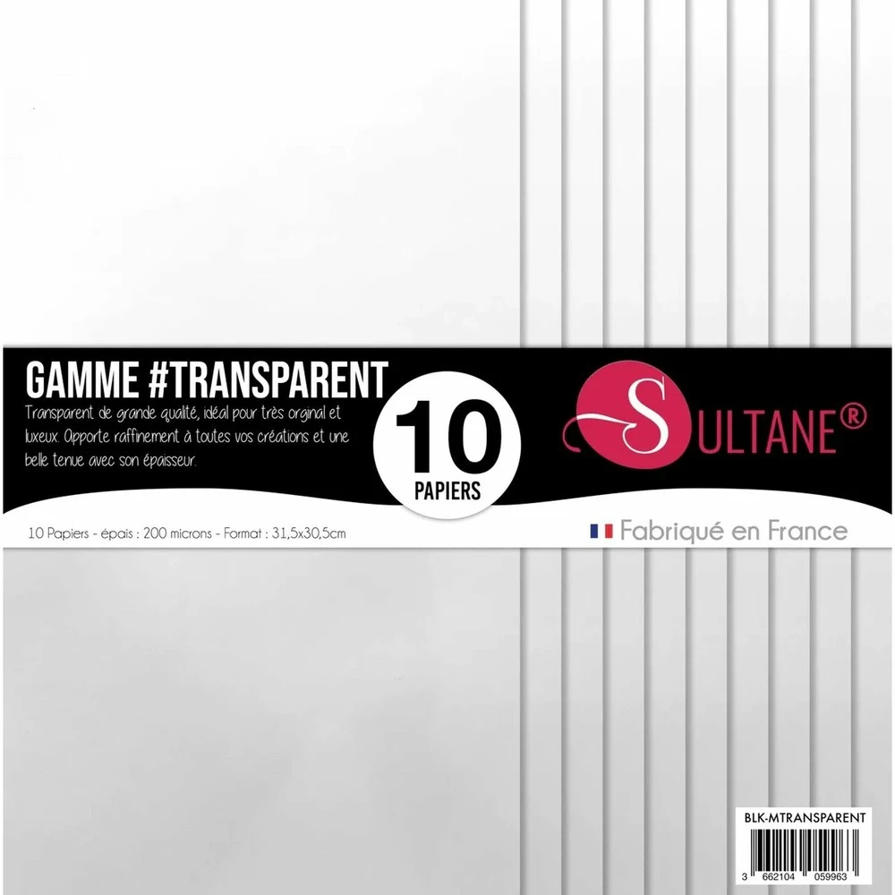 Le papier sultane matière transparent est de grande qualité pour des effets de transparence très originaux. Il apportera du raffinement à toutes vos créations et une belle tenue avec son grammage. Ce papier créatif peut-être embossé, encré et perforé facilement. Il vous donne donc de grandes possibilités de personnalisation pour vos loisirs créatifs. Les papiers matières de la marque sultane, utilisés depuis plus de 13 ans sont 100% français. Ces papiers scrapbooking sont fabriqués dans une imprimerie imprimvert, ce qui assure une production écologique. Ces papiers matières ont été travaillés afin qu’ils répondent à toutes vos utilisations en carterie et scrapbooking. 10 papiers transparents à embosser sultane, densité 200 g/m2. Dimensions : 31,5 x 30,5 cm.