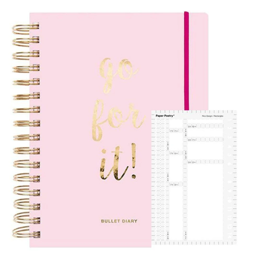 Agenda Bullet Journal Rose à Spirales 96 Feuilles + Pochoir Rectangles