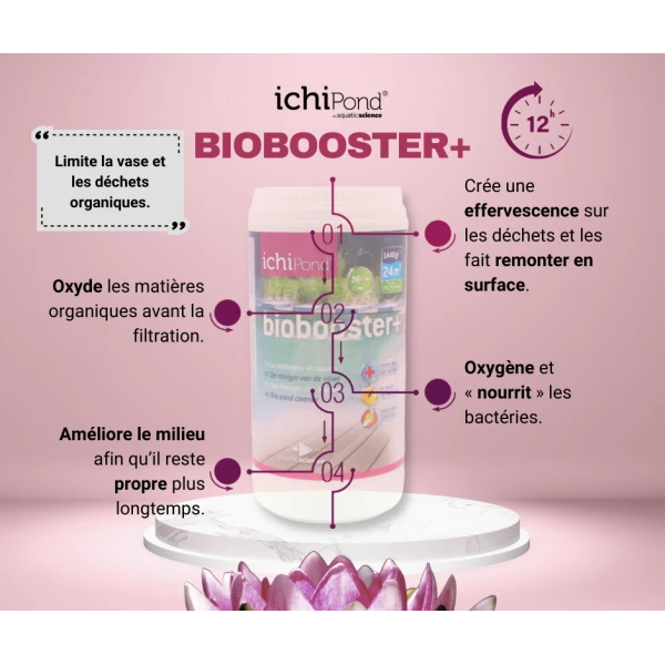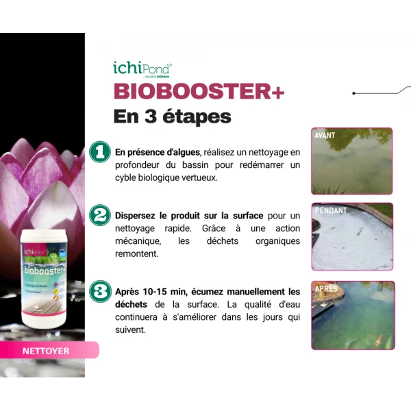 [img-4393-left-large_default] biobooster +: formulation concentrée destinée à doper l’activité des micro-organismes bénéfiques au bassin. L’effet incomparable sur les filaments, vases et autres déchets est déjà visible après quelques heures, aboutissant en quelques jours à leur radicale réduction et aussi de leurs conséquences. Sans agents phytos ni produits toxiques pour la filtration, l’environnement ou les poissons qui n’en sont que plus vigoureux et sains.