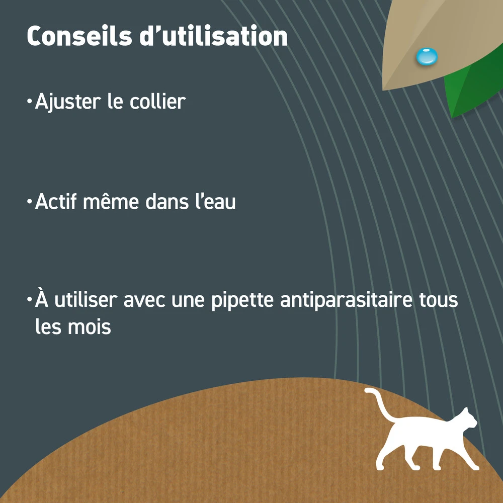 ajuster le collier autour du cou de l’animal en laissant le passage de deux doigts, l’ôter pour couper la partie non utilisée, puis fixer le collier autour du cou. Placer le morceau excédent sous le coussin (ou la couche), afin de profiter de l’action antiparasitaire du géraniol dans l’environnement proche de l’animal. Changer le collier tous les 3 mois environ. Actif même dans l’eau.