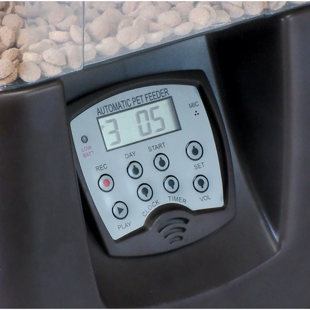 ⌠ce distributeur automatique de croquettes est programmable jusqu’Ă 4 distributions par jour. Votre animal aura l’impression d’ĂȘtre un vip avec son emploi du temps chargĂ© de repas.