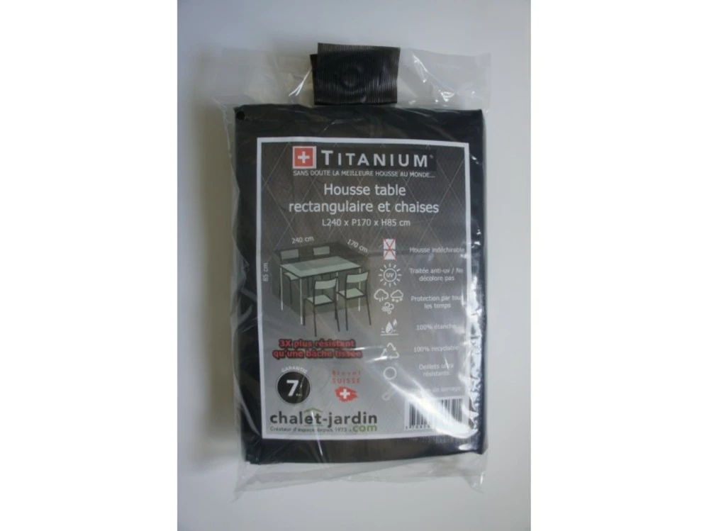 Techniquesdimensions ext. Hors tout (l x p x h) : 240 x 170 x 85 cmgrammage : 90 g/m ²matiã¨re : polyã©thylã¨necoloris : noir rayã© blancinclus : cordon de serrage ultra rã©sistantssouple et lã©gã¨re / 100 % recyclable / 100 % ã©tanche ã l’eau, ã la poussiã¨re et aux uv / rã©siste aux changements de tempã©ratures et ã de nombreux produits chimiques colis dimensions colis : 40 x 30 x 40 cmpoids unitaire : 1,100 kgcette housse de protection pour votre table rectangulaire et vos chaises vous permettra de protã©ger votre mobilier en le gardant au sec et ã l’abri des intempã©ries. Cette housse de protection bã©nã©ficie d’un procã©dã© ultrasonique pour une meilleure rã©sistance, systã¨me brevetã© (suisse).avantages : ultra rã©sistant, technologique, opaque, traitã© pour une protection uv, pratique, ne nã©cessite aucun entretien