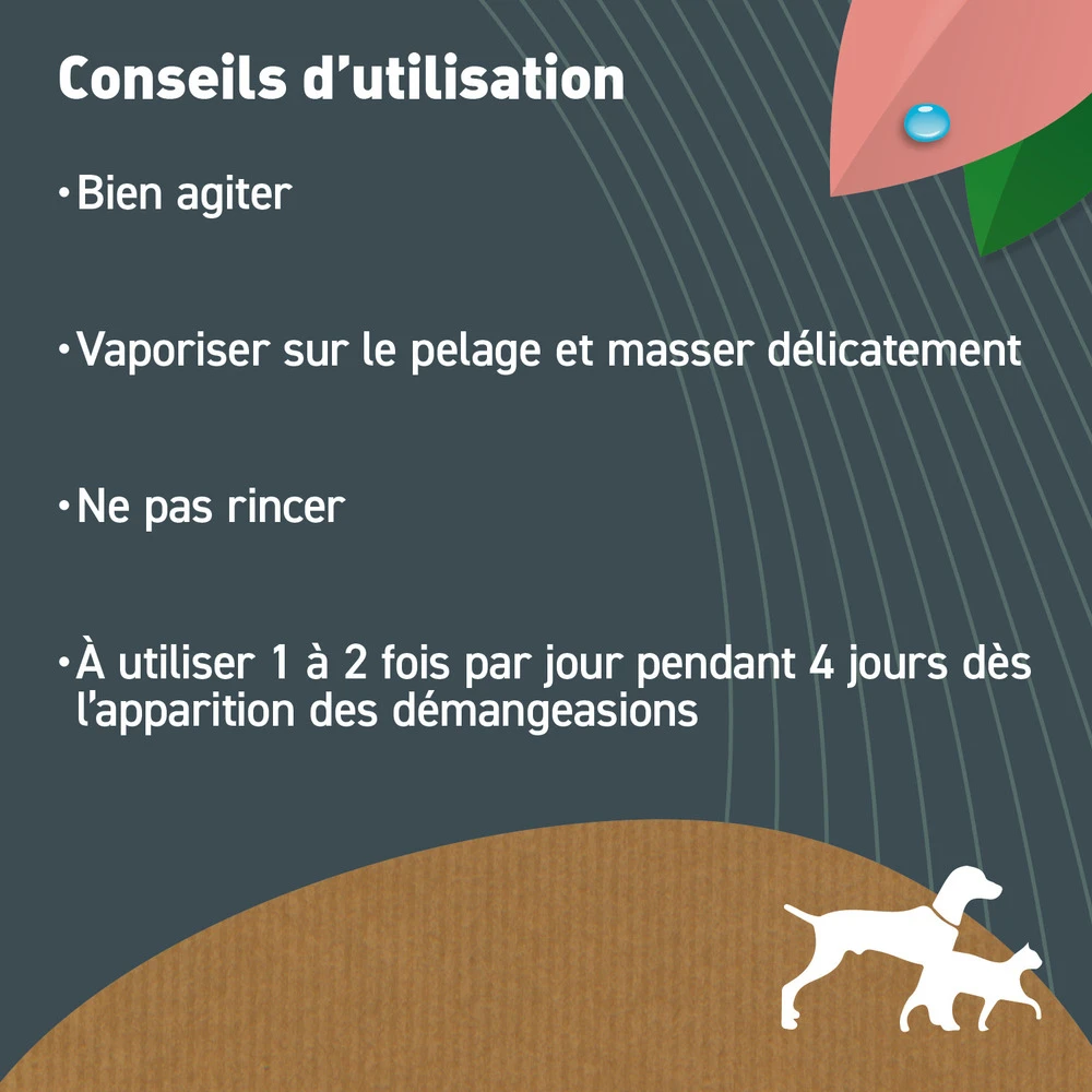 | Conseils d'utilisation | Vaporiser sur le pelage, à raison de 1,5 ml par kg de poids vif (2 pressions) à une distance de 20 cm environ. Masser pour une meilleure diffusion. Laisser agir. Ne pas rincer. A utiliser dès l’apparition des démangeaisons, 1 à 2 fois par jour, pendant 4 |
