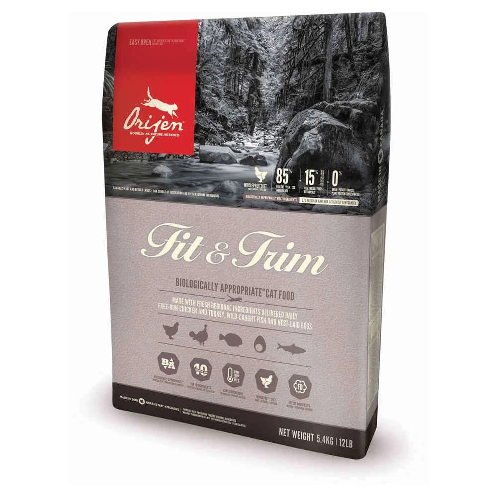 Ces croquettes Orijen Fit and Trim sans céréales pour chats en surpoids contiennent moins de matières grasses et de glucides. Elles apportent des protéines animales nutritives provenant de poulet et dinde élevés en libertés, oeufs pondus et poissons pêchés à l’état sauvage, tous sont livrés frais ou crus dans des proportions WholePrey. Sac de 5,4 kg.