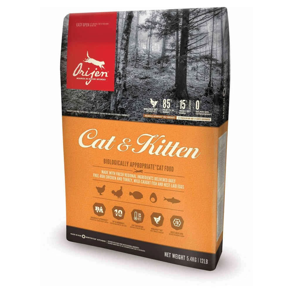 Alimentation pour chats et chatons sans céréales. Orijen Cat & Kitten regorge de protéines nourrissantes et de matières grasses provenant de poulet et de dinde élevés en liberté, de poissons sauvages et d’oeufs entiers pondus au nid, tous sont livrés frais ou crus dans des proportions WholePrey. Sac de 5,4 kg.