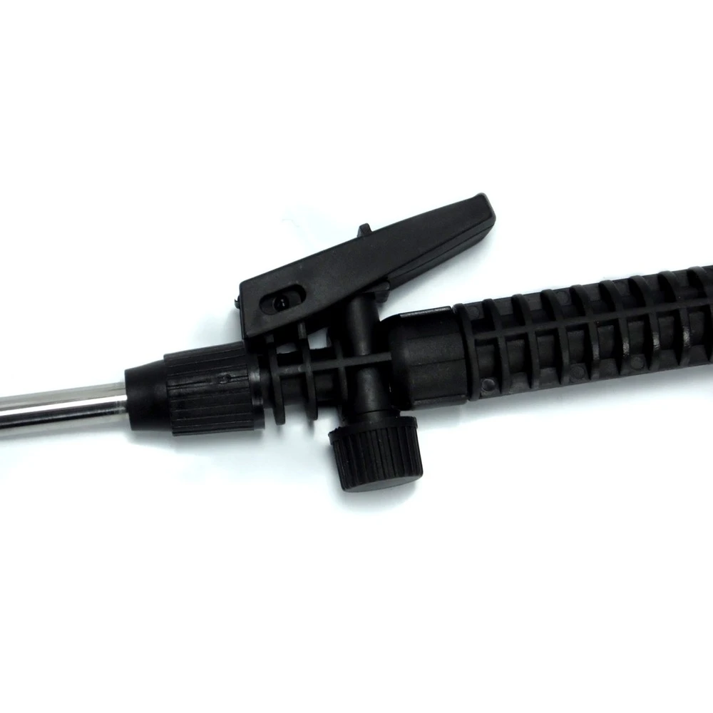 sa lance de pulvérisation de 50 cm de longueur est en aluminium. Elle est équipée d’une buse sprayer et reliée à la cuve de celui-ci par un tuyau souple d’ 1.15 mètres. Sur la poignée de cette lance se trouve une molette de réglage du débit.