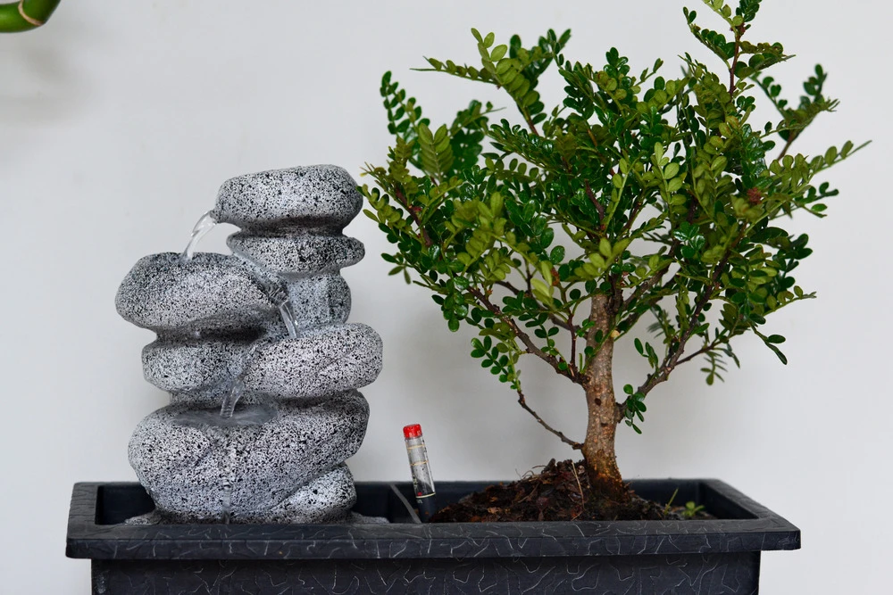 l’arrangement de bonsaï est livré avec une véritable cascade qui coule. Le son de l’eau qui coule doucement vous aidera à vous calmer et à rester détendu. La cascade est très facile à utiliser : remplissez le récipient d’eau, branchez-le et l’eau commence à couler ! La petite pompe à eau ne fait pratiquement aucun bruit, de sorte que ce magnifique arrangement oriental peut être utilisé non seulement à la maison, mais aussi au bureau. La composition bonsaï peut également être placée sur votre bureau, pour vous garder « zen » toute la journée.