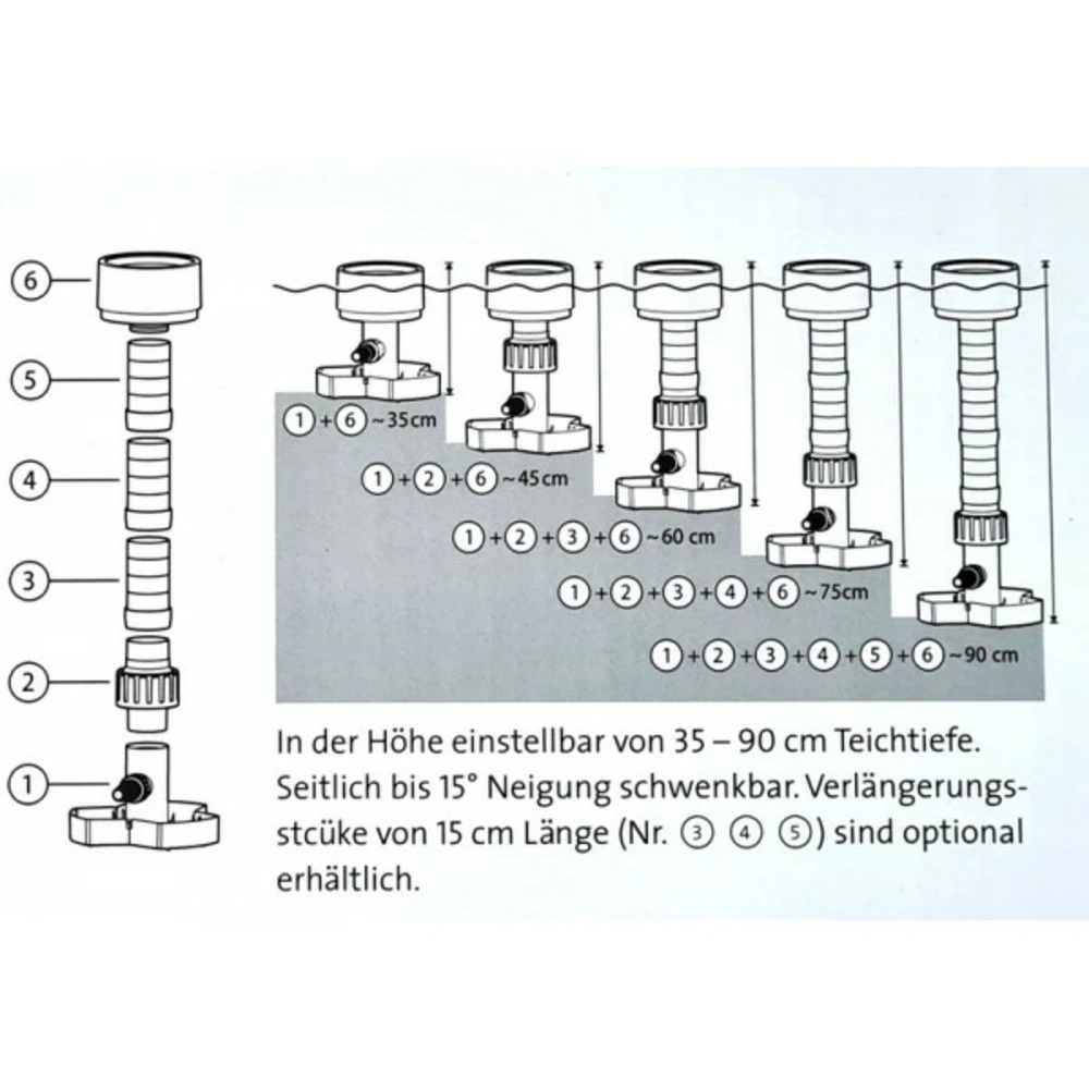 Le flotteur sur le panier-filtre compense les diffĂ©rences de hauteur jusqu’Ă 8 cm. Pour Ă©tangs jusqu’Ă 40 m² de surface maximum.