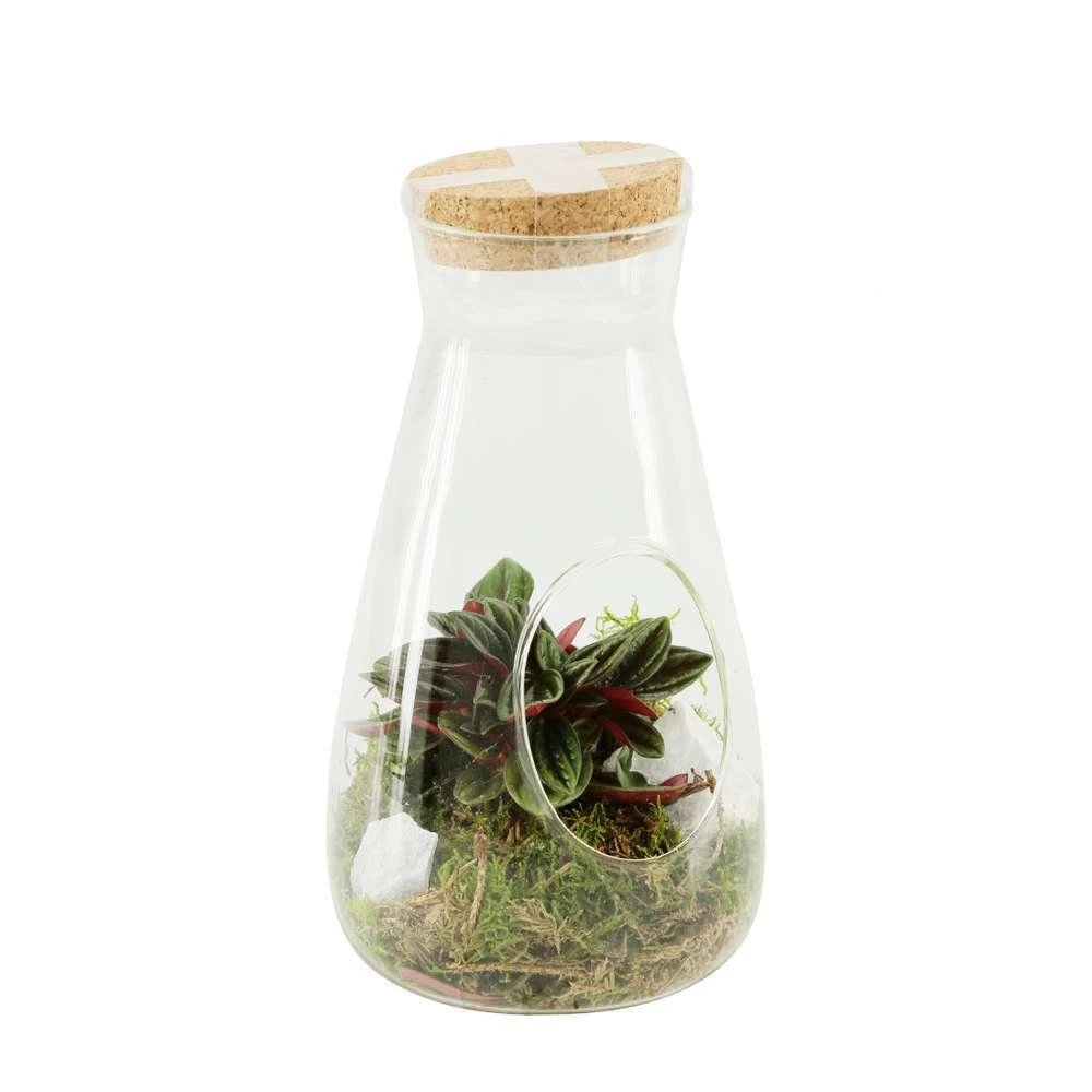 Les plantes qui vivent dans un terrarium en verre, nécessitent peu d’entretien. Le contenant fermé favorise d’une part la photosynthèse, et d’autre part le cycle de l’eau. C’est un véritable petit écosystème qui se suffit à lui-même. Au cours de la journée la plante, sous l’action de la photosynthèse absorbe le dioxyde de carbone et rejette de l’oxygène, la nuit le phénomène s’inverse. Le tout va développer de la condensation, qui apportera l’eau nécessaire à la croissance de la plante.
